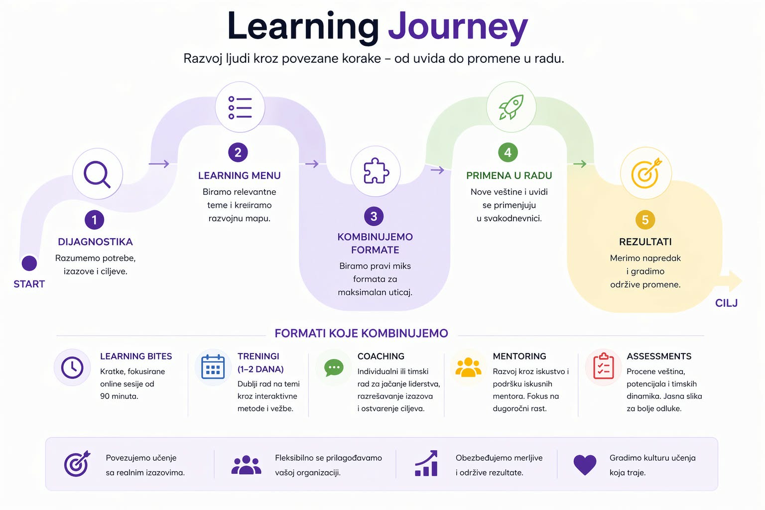 To znači da razvoju pristupamo kao celini, vašem personalzovanom Learning Journey-ju.